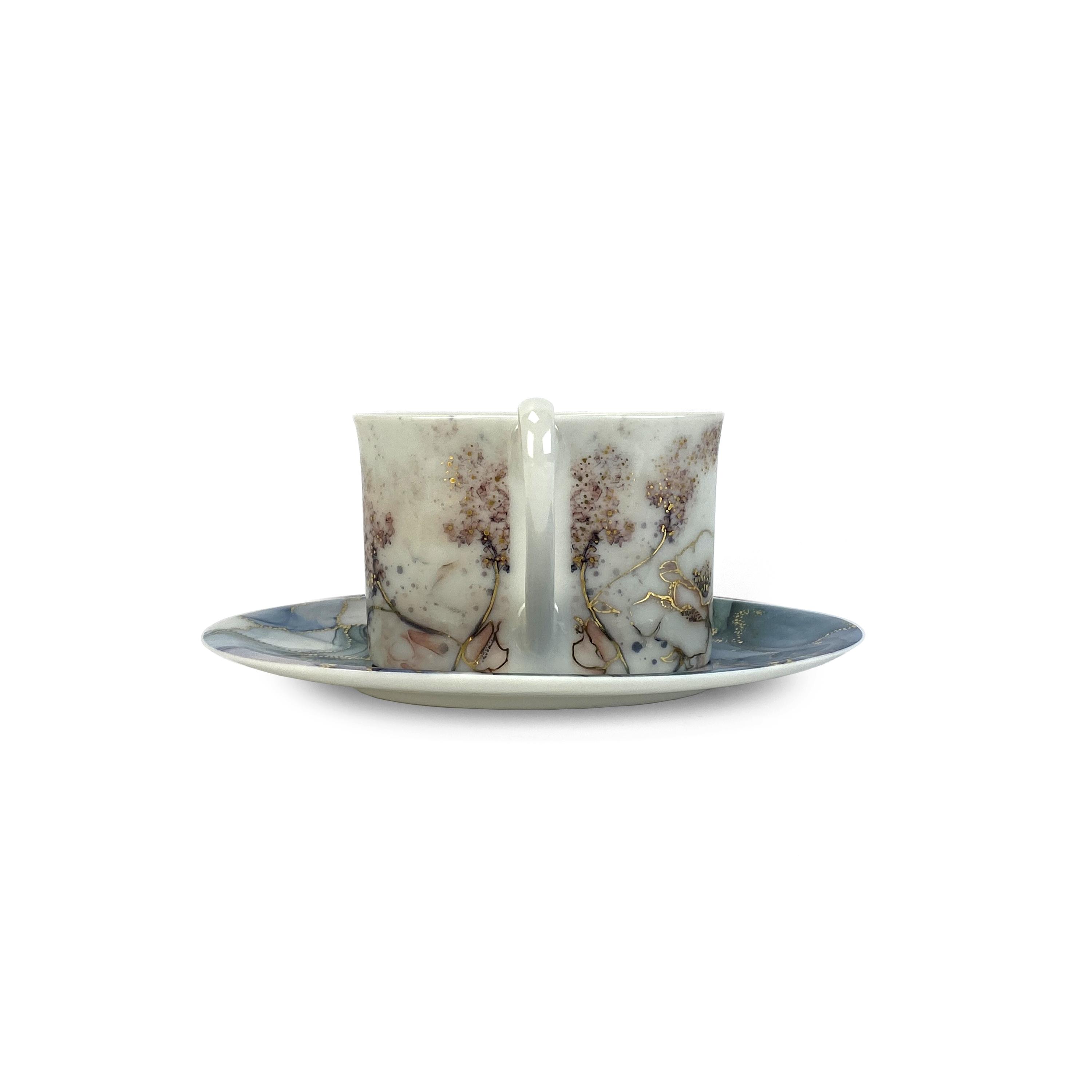 This delicate handmade porcelain coffee cup with saucer is crafted in soft light blue and white tones. It is adorned with elegant images of flowers, adding a special charm and freshness to the set. Perfect for enjoying coffee in a cozy and aesthetically pleasing setting, this set brings a touch of natural harmony and beauty to your morning or evening coffee ritual.