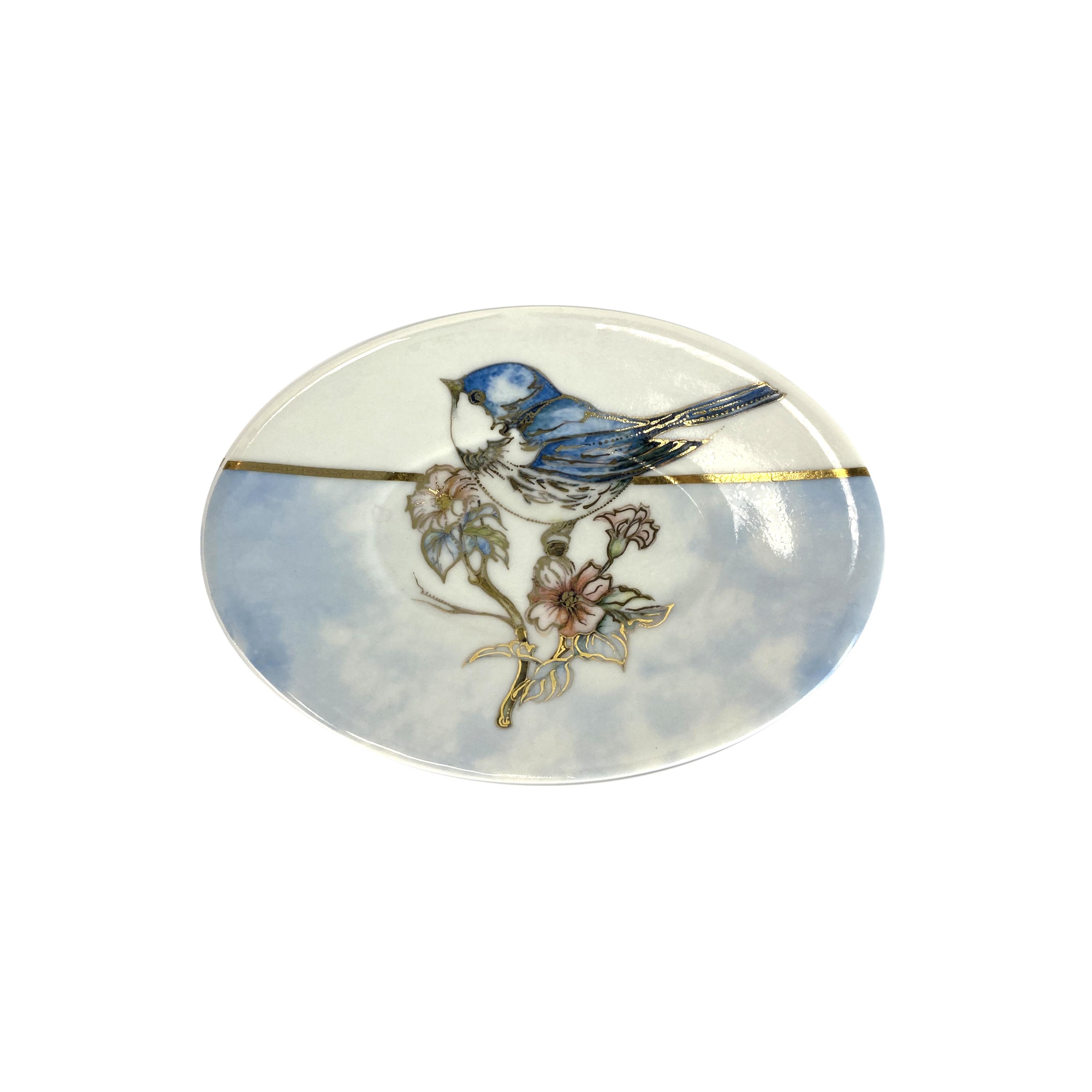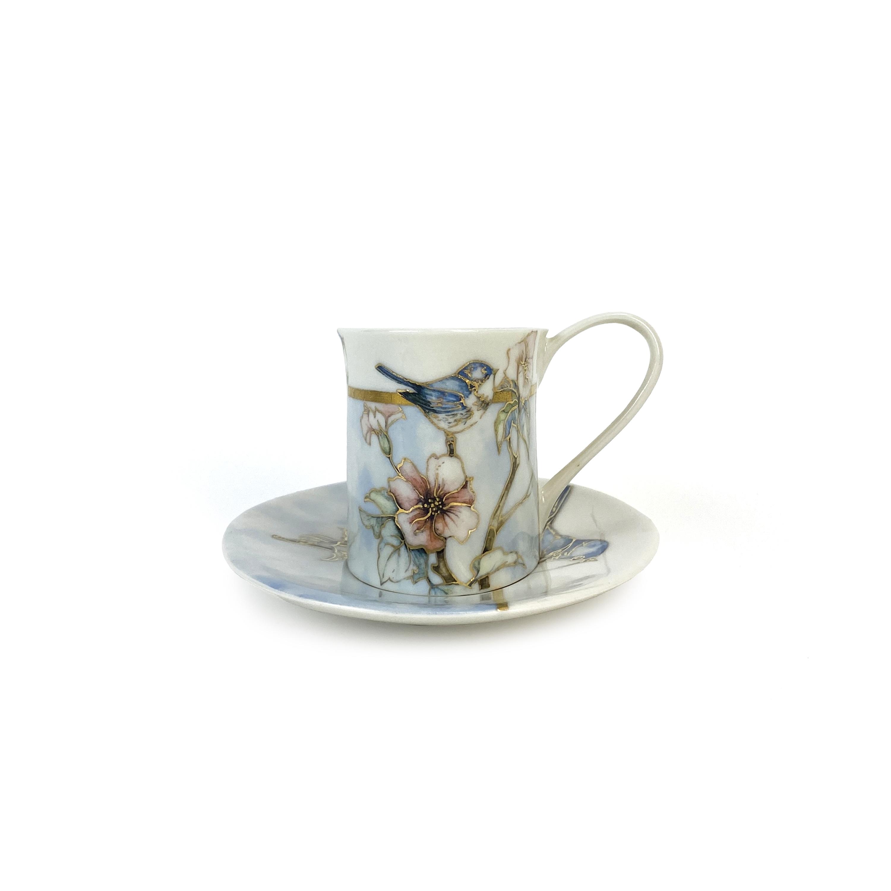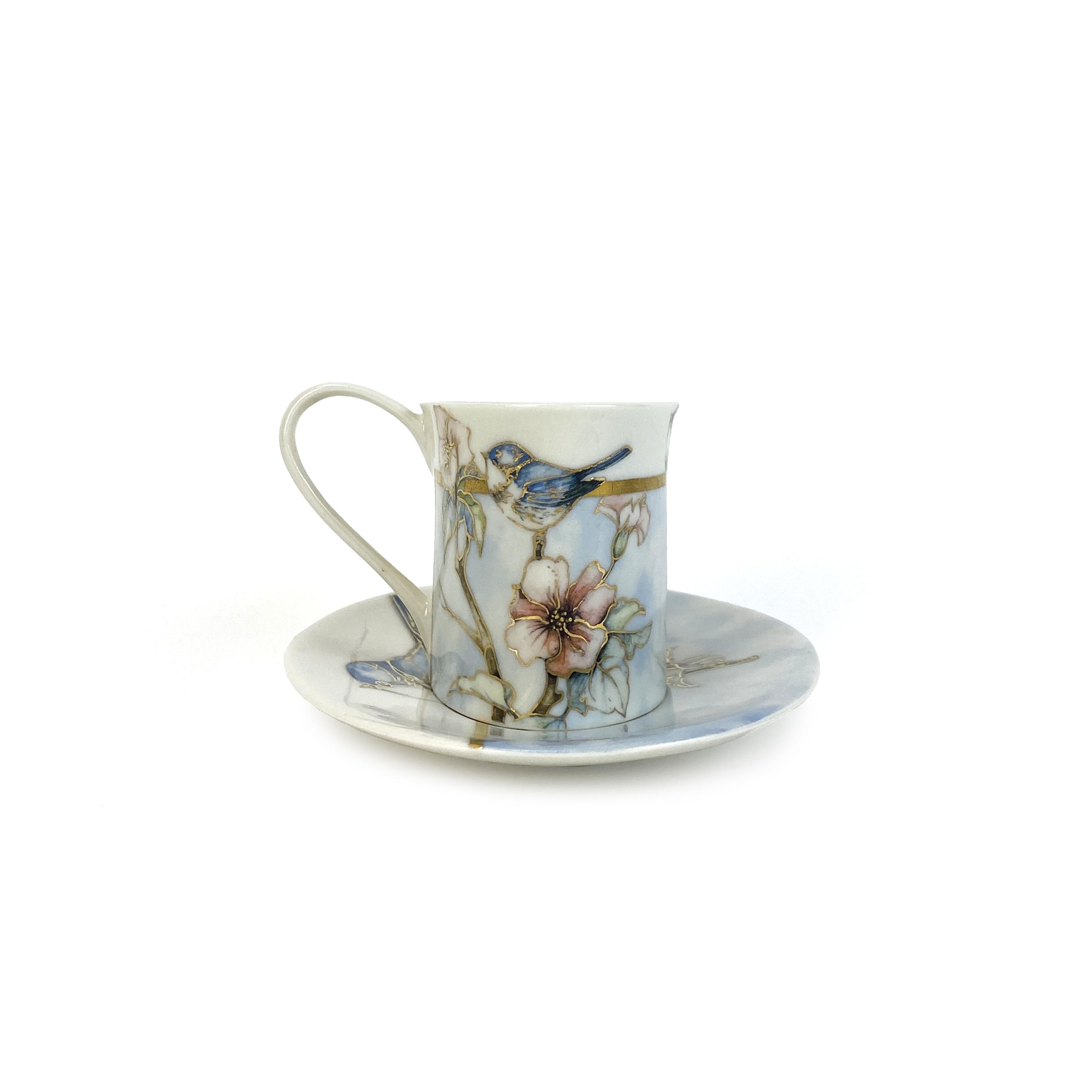 This delicate handmade porcelain coffee cup with saucer is crafted in soft light blue and white tones. It is adorned with elegant images of birds and flowers, adding a special charm and freshness to the set. Perfect for enjoying coffee in a cozy and aesthetically pleasing setting, this set brings a touch of natural harmony and beauty to your morning or evening coffee ritual.