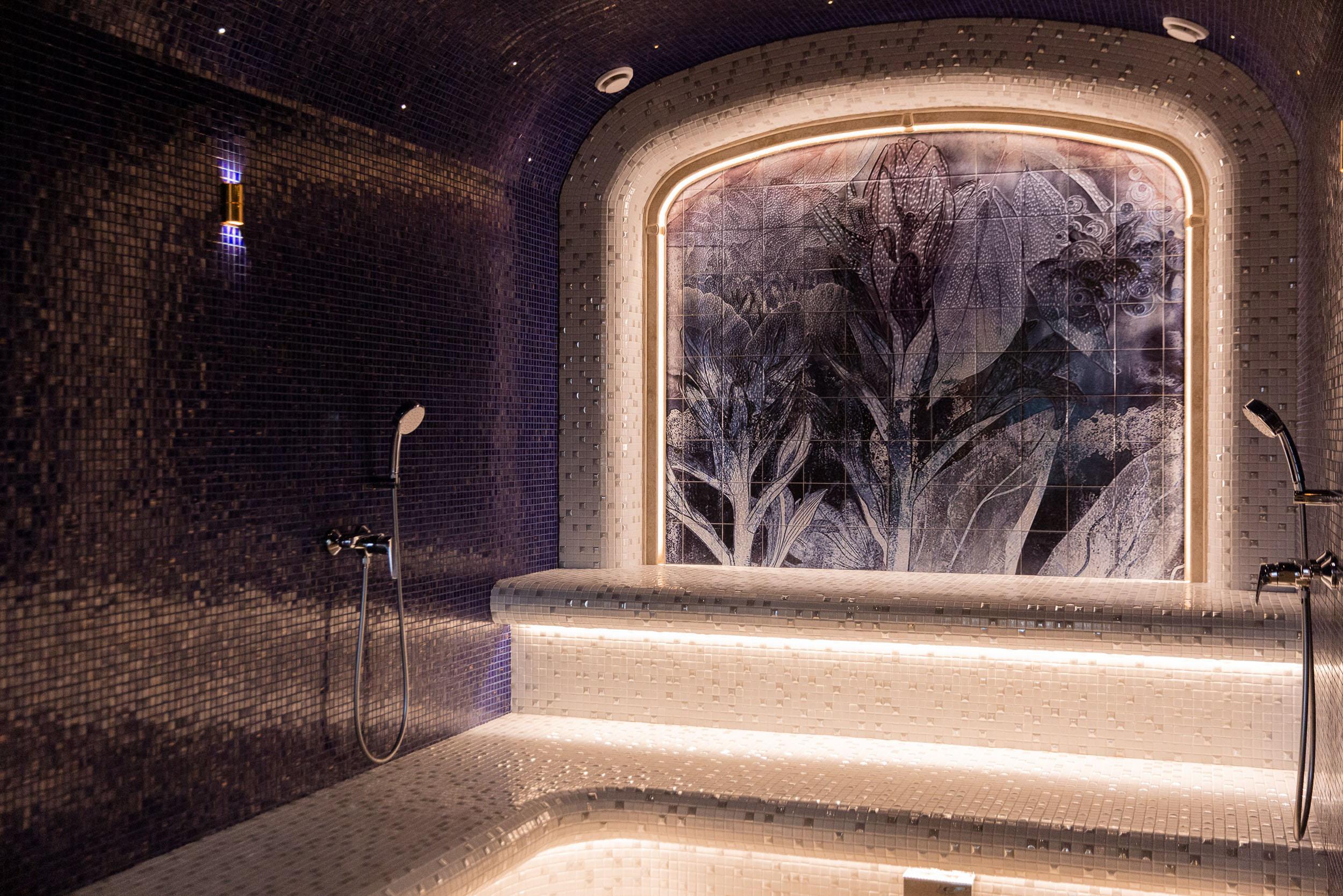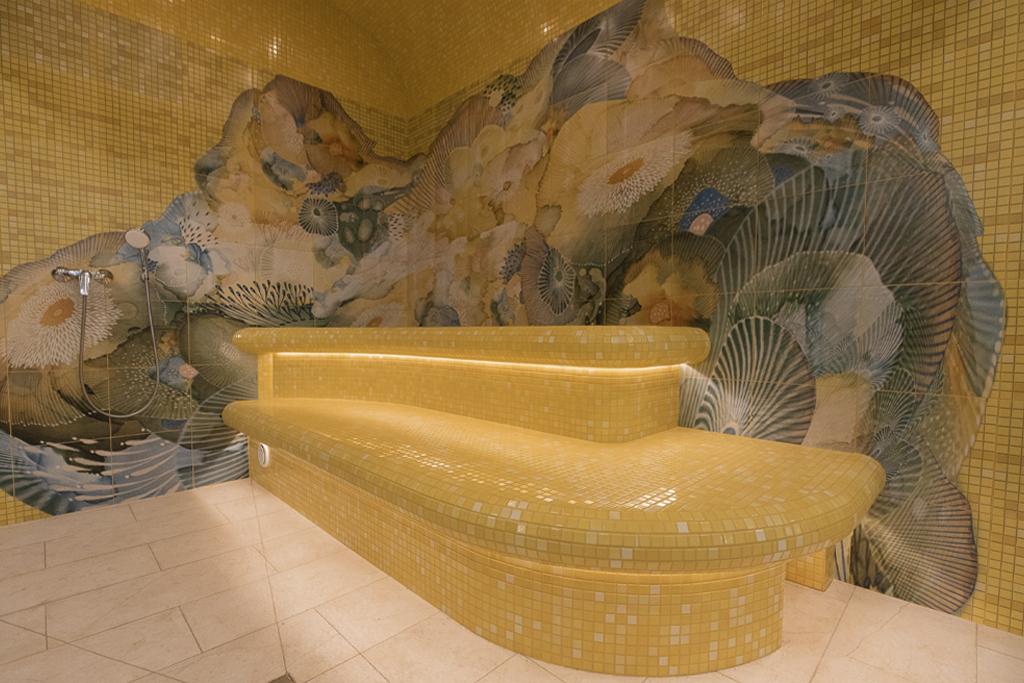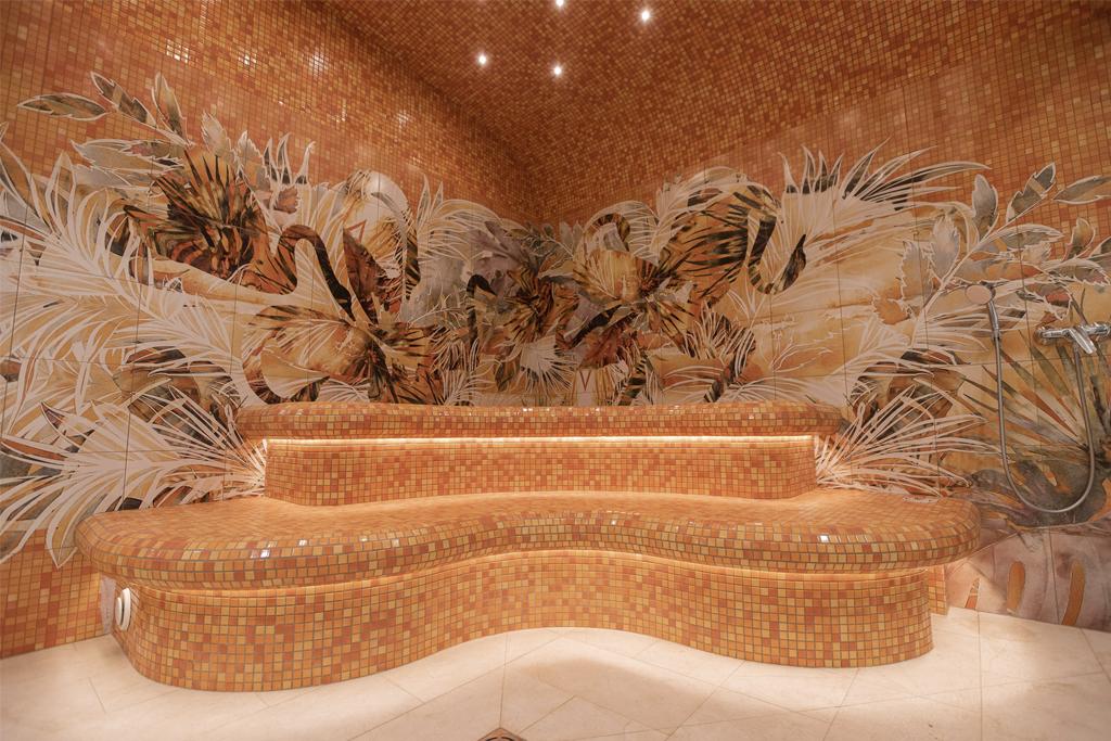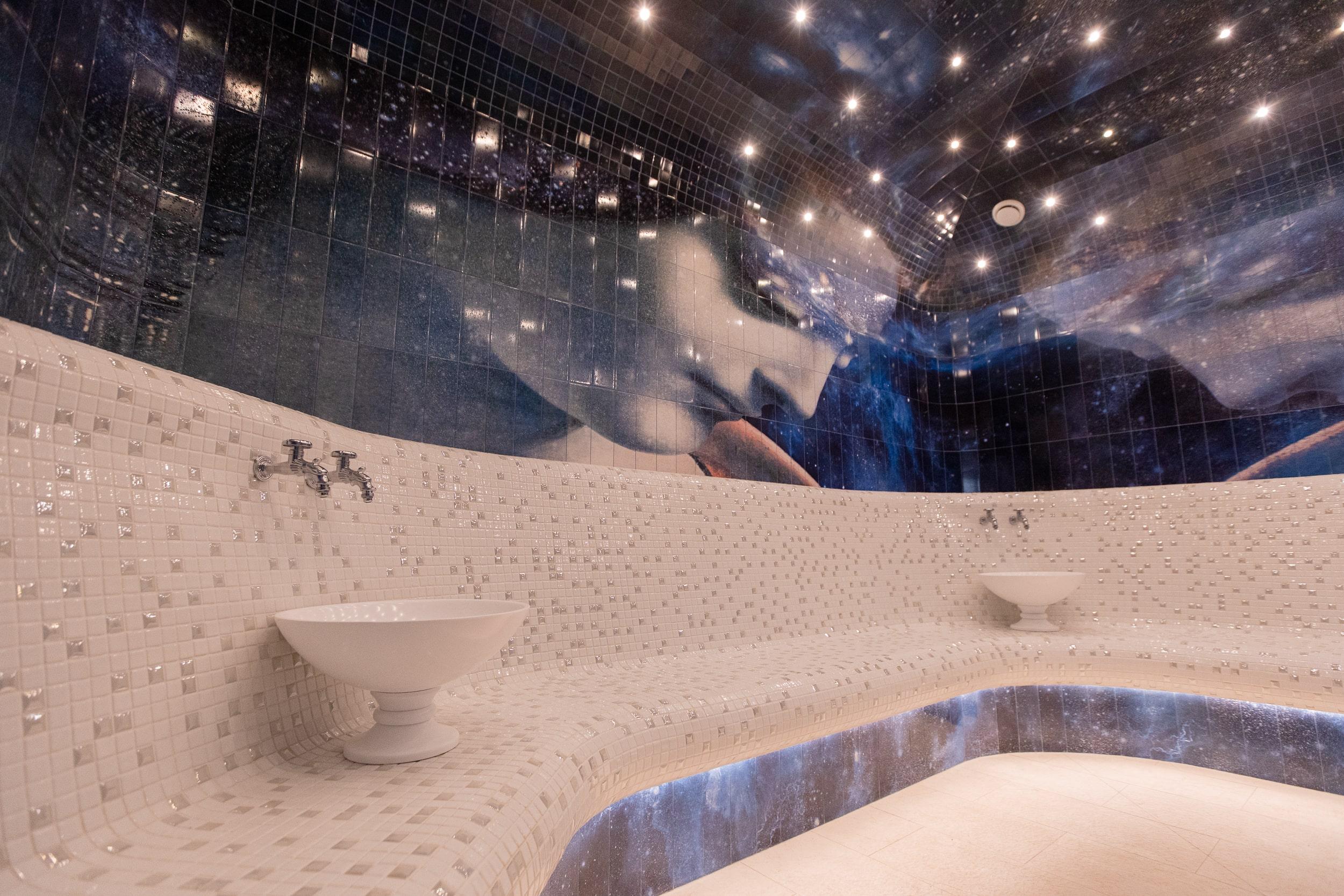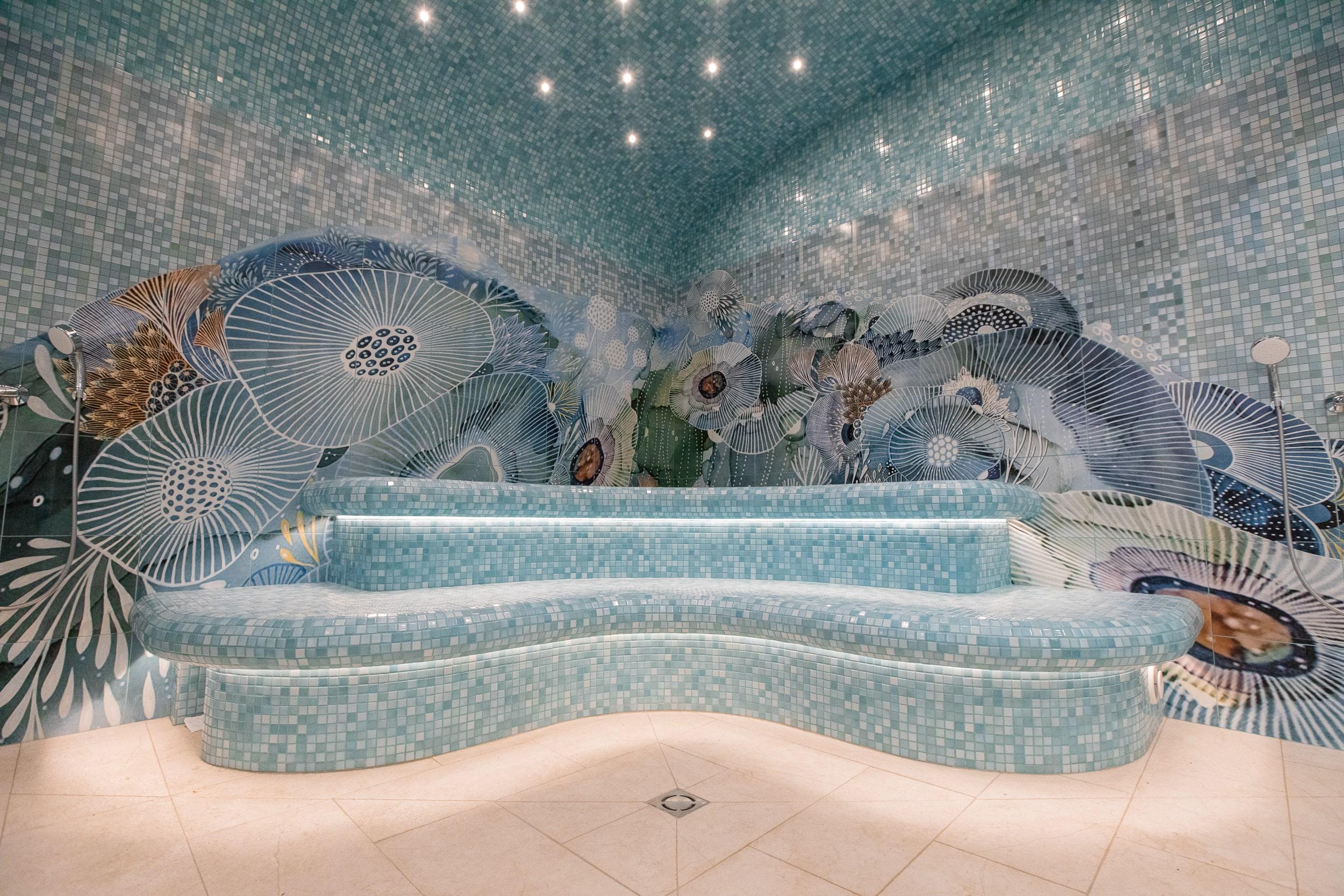 The design of the hammam and the entire thermal zone of Oceanis — a spa aquapark in Nizhny Novgorod, Russia — features handcrafted ceramic elements by the artisans of Laguz Studio.