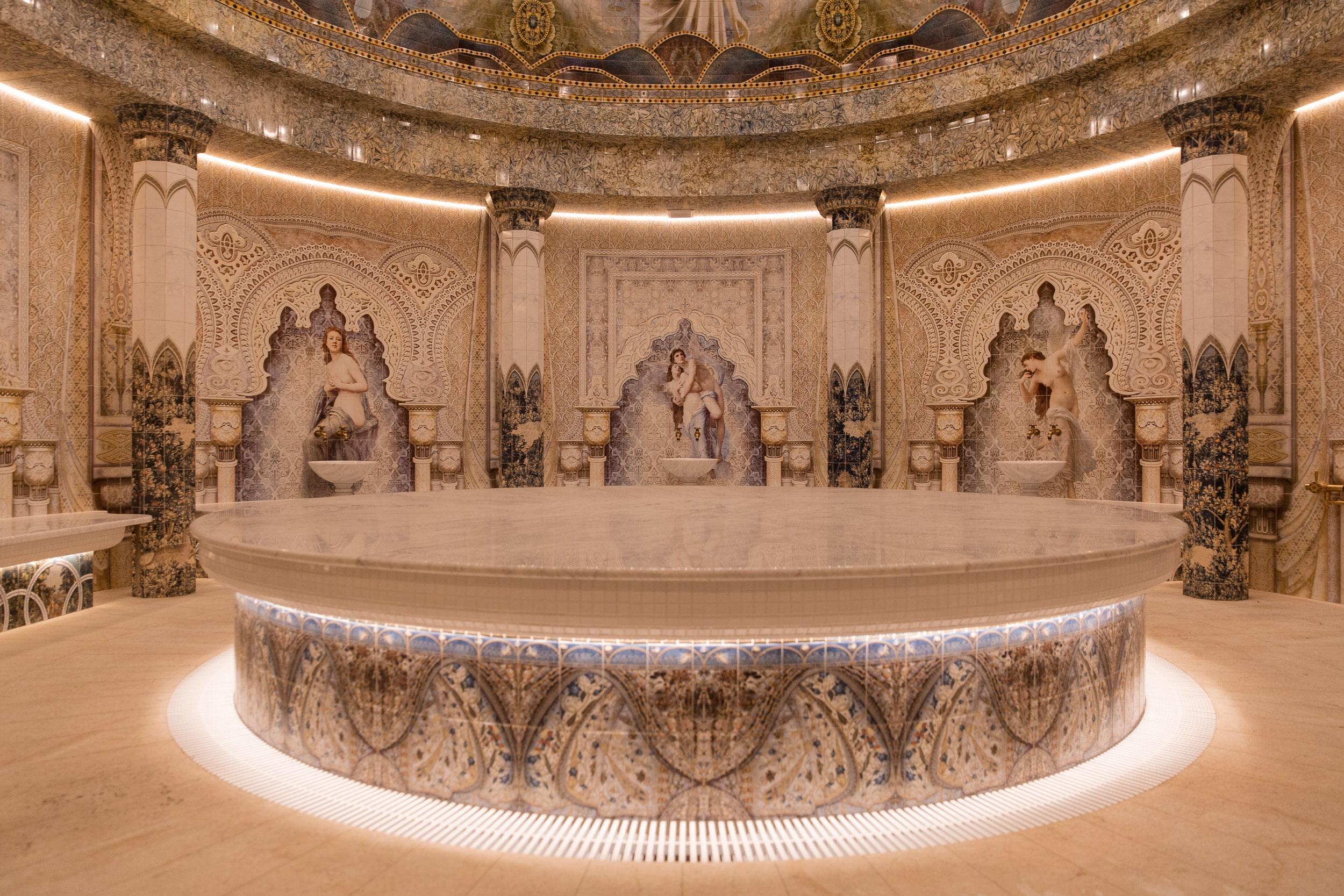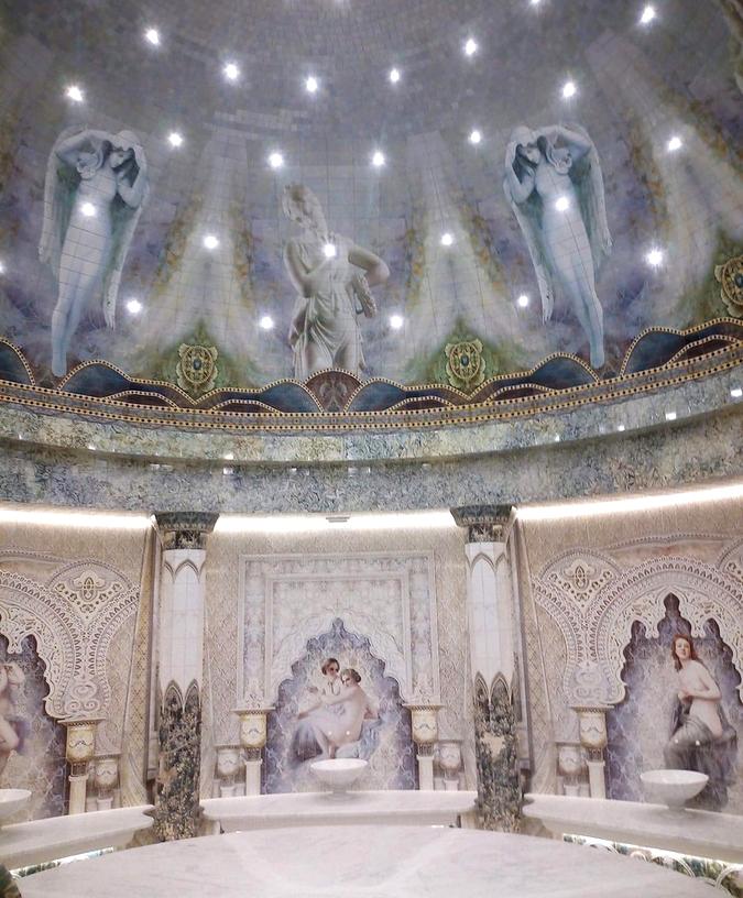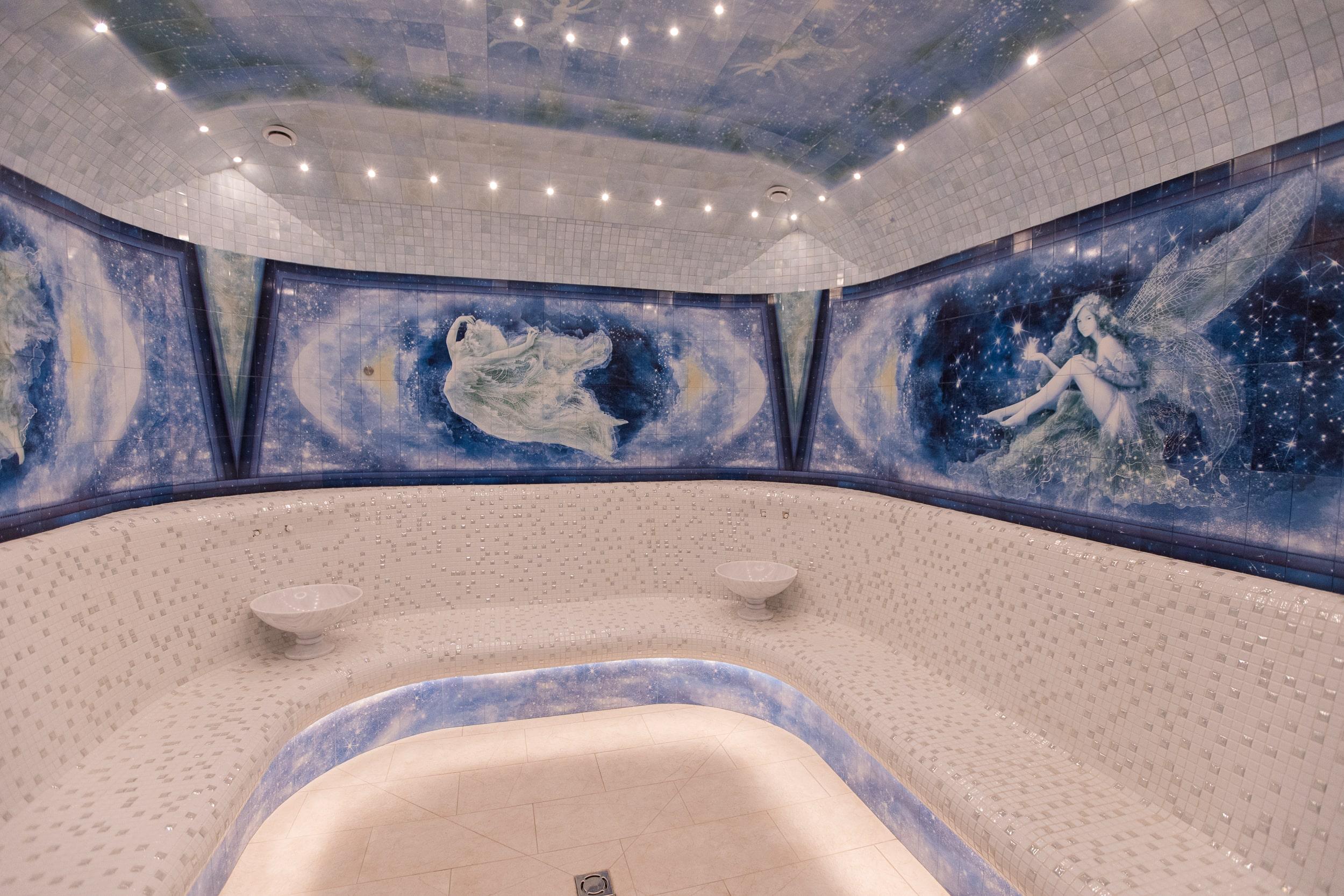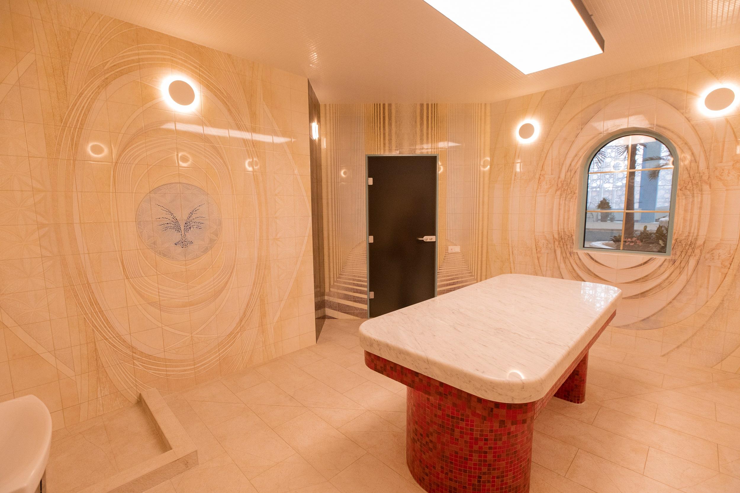 The design of the hammam and the entire thermal zone of Oceanis — a spa aquapark in Nizhny Novgorod, Russia — features handcrafted ceramic elements by the artisans of Laguz Studio.