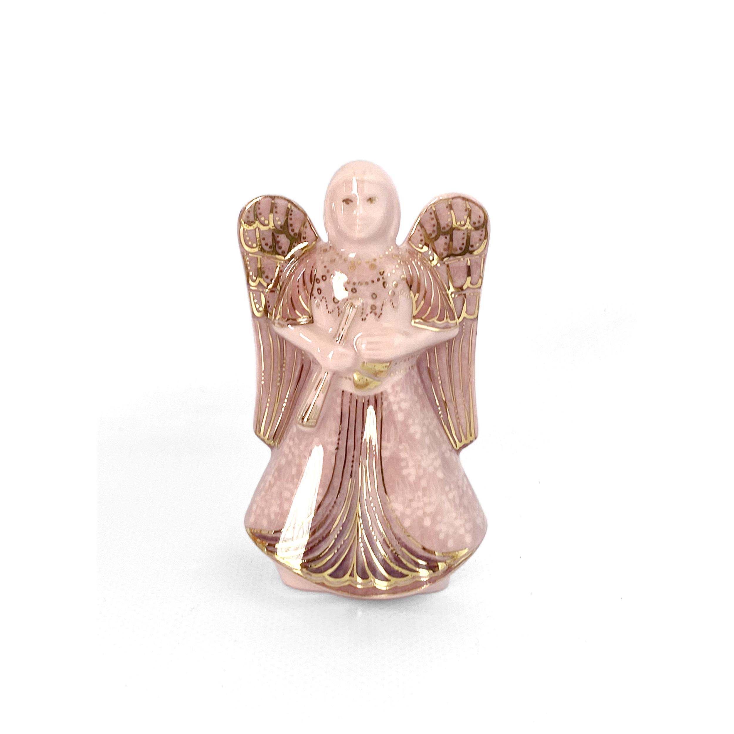 This charming blush pink angel figurine is a symbol of warmth and love. Featuring shimmering gold detailing throughout her wings and gown, this handcrafted angel holds a musical instrument, bringing a sense of calm and tranquility to any room. The soft pink hue adds a touch of softness, making her a perfect gift for special occasions or a lovely addition to any angel collection.