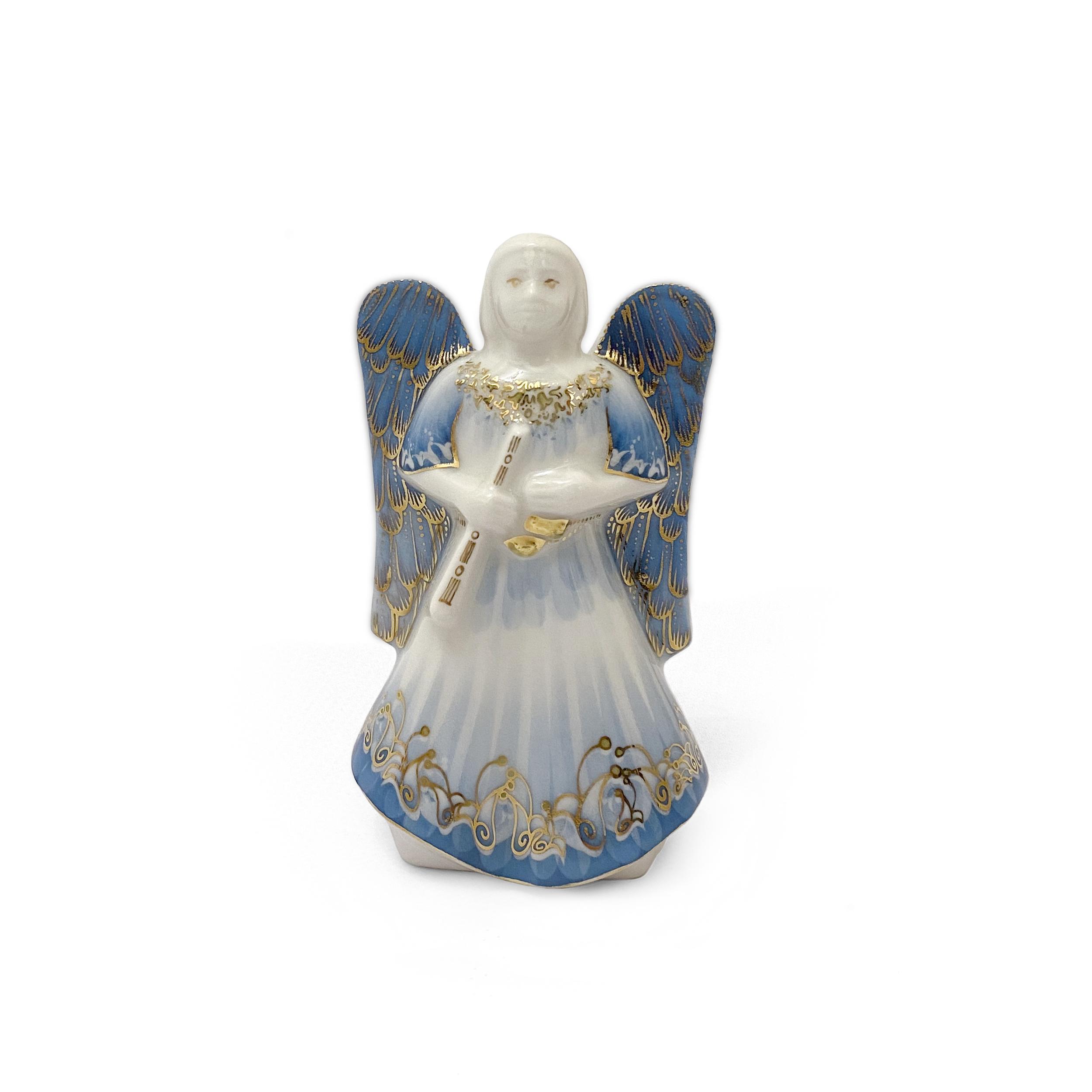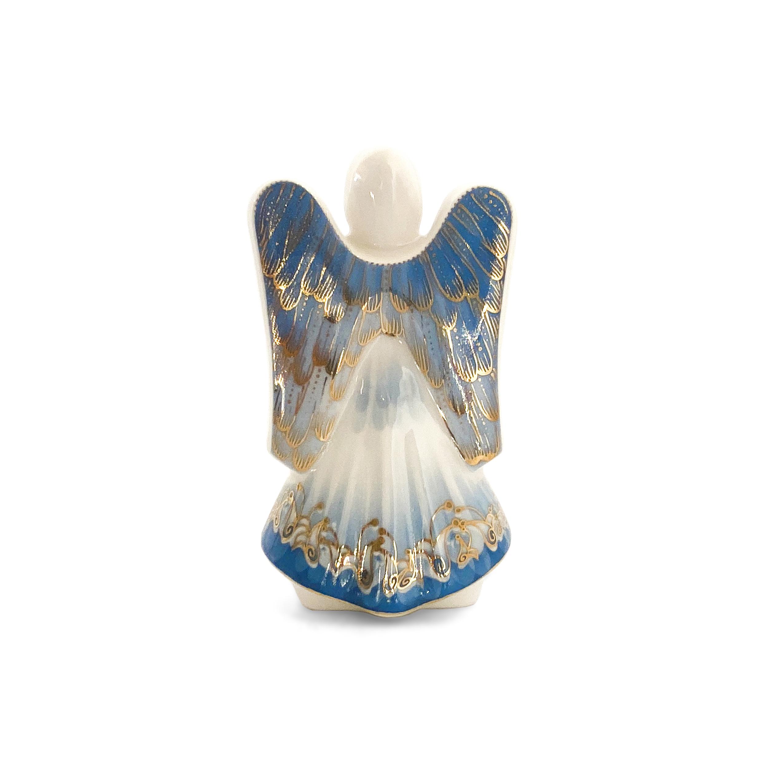 This stunning blue angel figurine is a vision of serenity and grace, meticulously handcrafted to perfection. Dressed in a flowing blue gown adorned with intricate gold detailing, this angel exudes a calm and peaceful presence. Her beautifully designed wings feature a delicate pattern that enhances the elegance of the overall design. With soft facial features and a musical instrument in hand, this angel symbolizes harmony and spiritual tranquility.