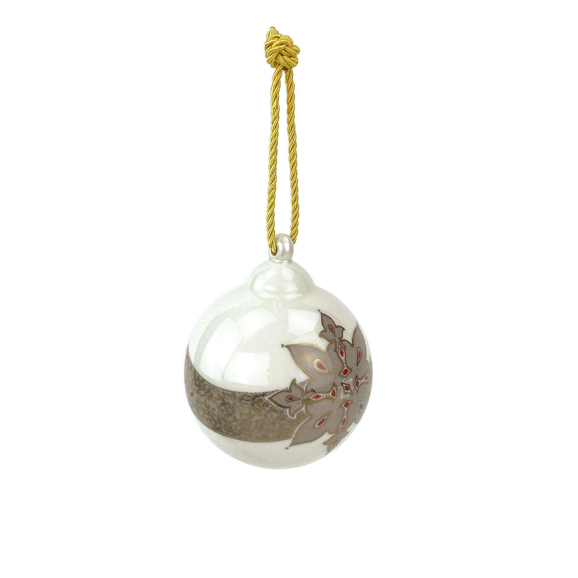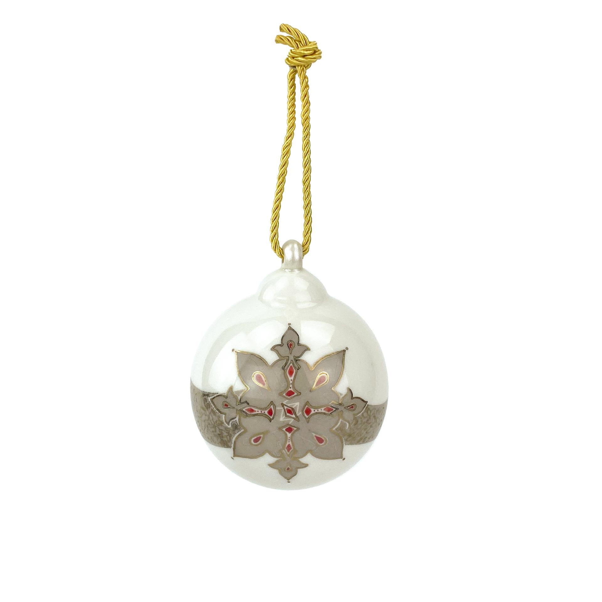 Celebrate the festive season with this sophisticated handmade porcelain Christmas ball. Crafted with precision, the ornament features a beautifully designed snowflake motif in subtle beige, gold, silver and red tones, perfectly accentuated by a delicate band of intricate patterns. The glossy finish adds a touch of refinement, while the silver cord provides an elegant way to display it.