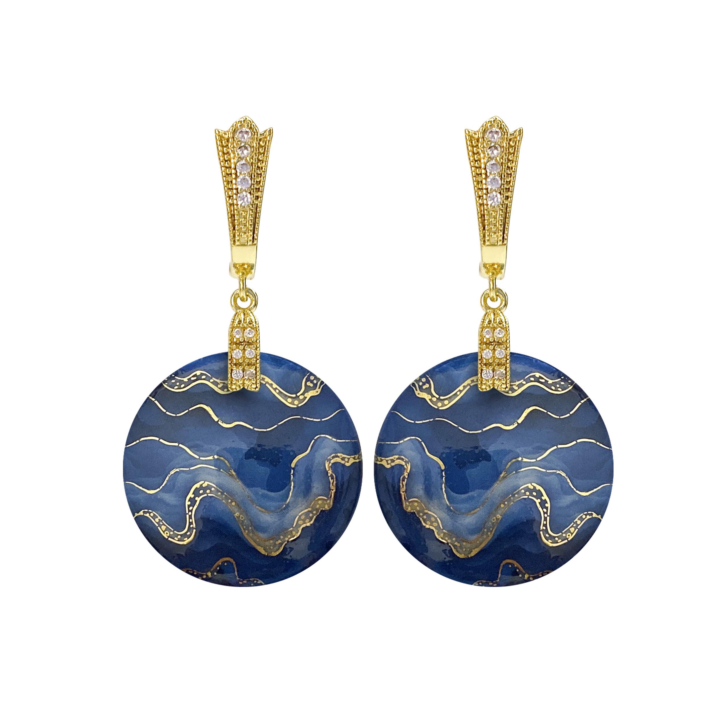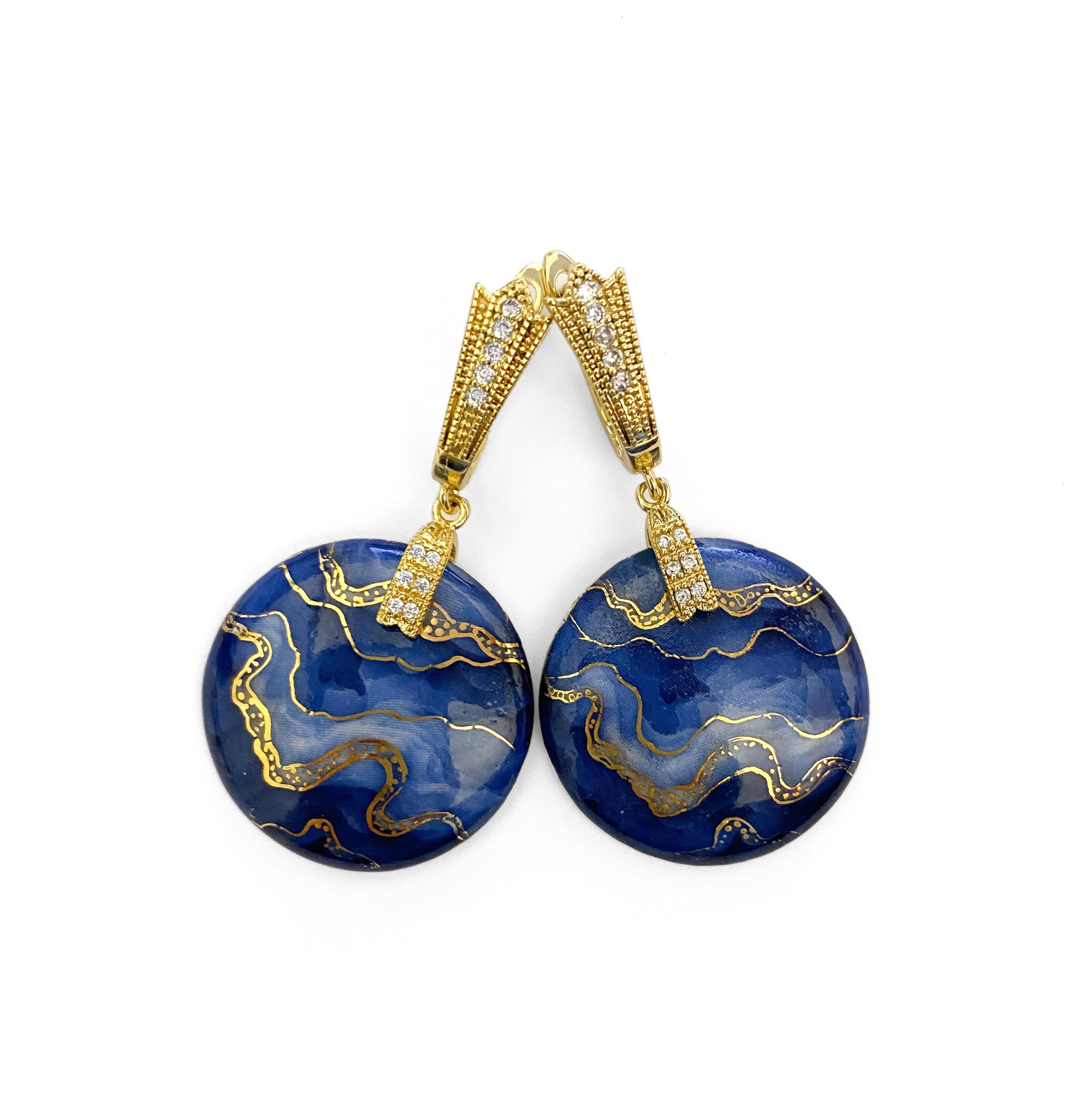 Statement earrings crafted from hand-painted porcelain, featuring deep blue hues accentuated by flowing golden lines. The circular porcelain elements are paired with sparkling, premium-grade fittings that enhance the refined elegance of the design.