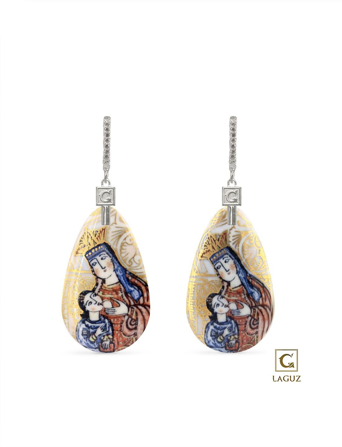 Elevate your style with these stunning porcelain earrings, featuring an intricate depiction of a mother and child motif, inspired by classic religious art. Framed in luxurious gold accents, each piece showcases the fine craftsmanship and artistry that Laguz stands for. The drop design is enhanced with a delicate silver stud encrusted with shimmering stones, ensuring both elegance and comfort. Perfect for those who appreciate cultural heritage and timeless beauty, these earrings are a statement of sophistication and grace.