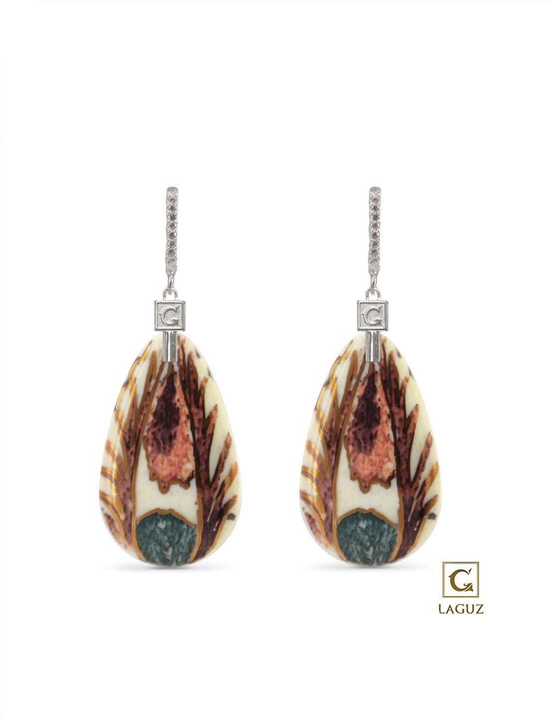 Make a bold statement with these elegant drop-shaped porcelain earrings, adorned with a unique abstract design that blends earthy tones and golden details. Set on a silver frame and encrusted with shimmering stones, these earrings offer both sophistication and comfort. Perfect for adding a touch of artistic flair to any outfit, they embody the spirit of timeless beauty and individuality.