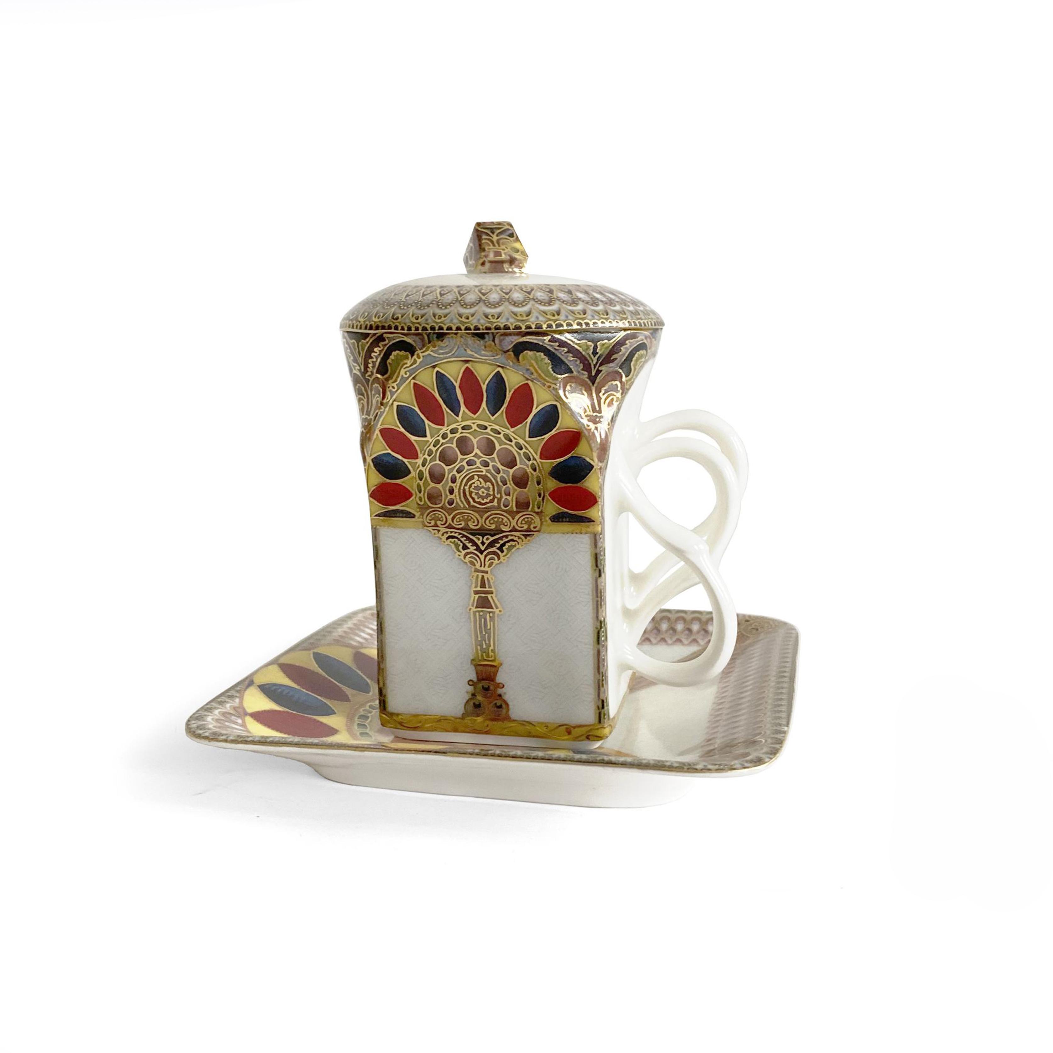 This exquisite set, featuring a porcelain coffee cup with a saucer, is adorned with Eastern ornamentation and is a stylish and functional addition to your coffee service. The vibrant pattern in shades of gold, red, purple, and yellow highlights the luxury and sophistication of these pieces. Crafted with precision and elegance, the cup and saucer are not only practical for everyday use but also serve as decorative items, adding a touch of Eastern culture and refinement to your home.