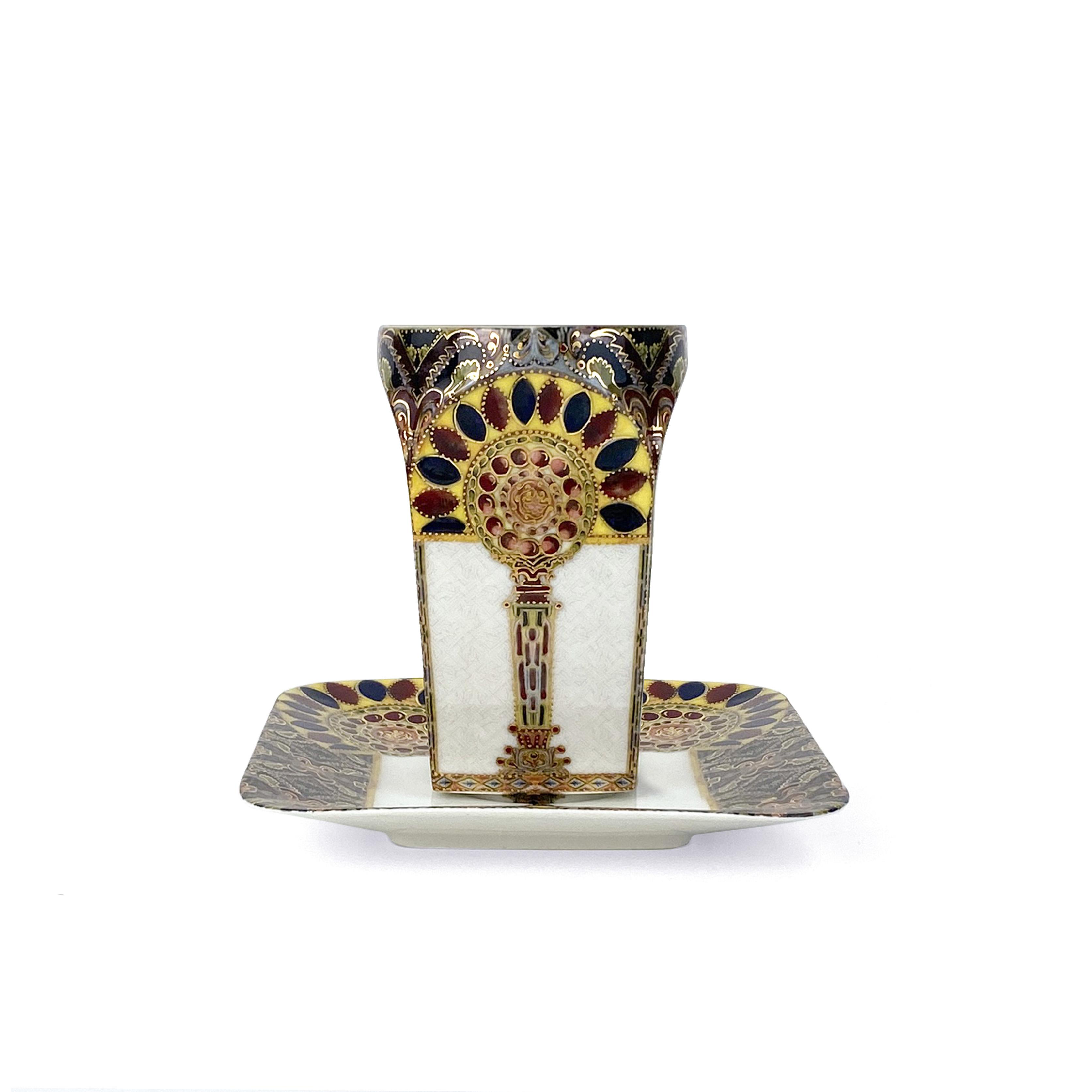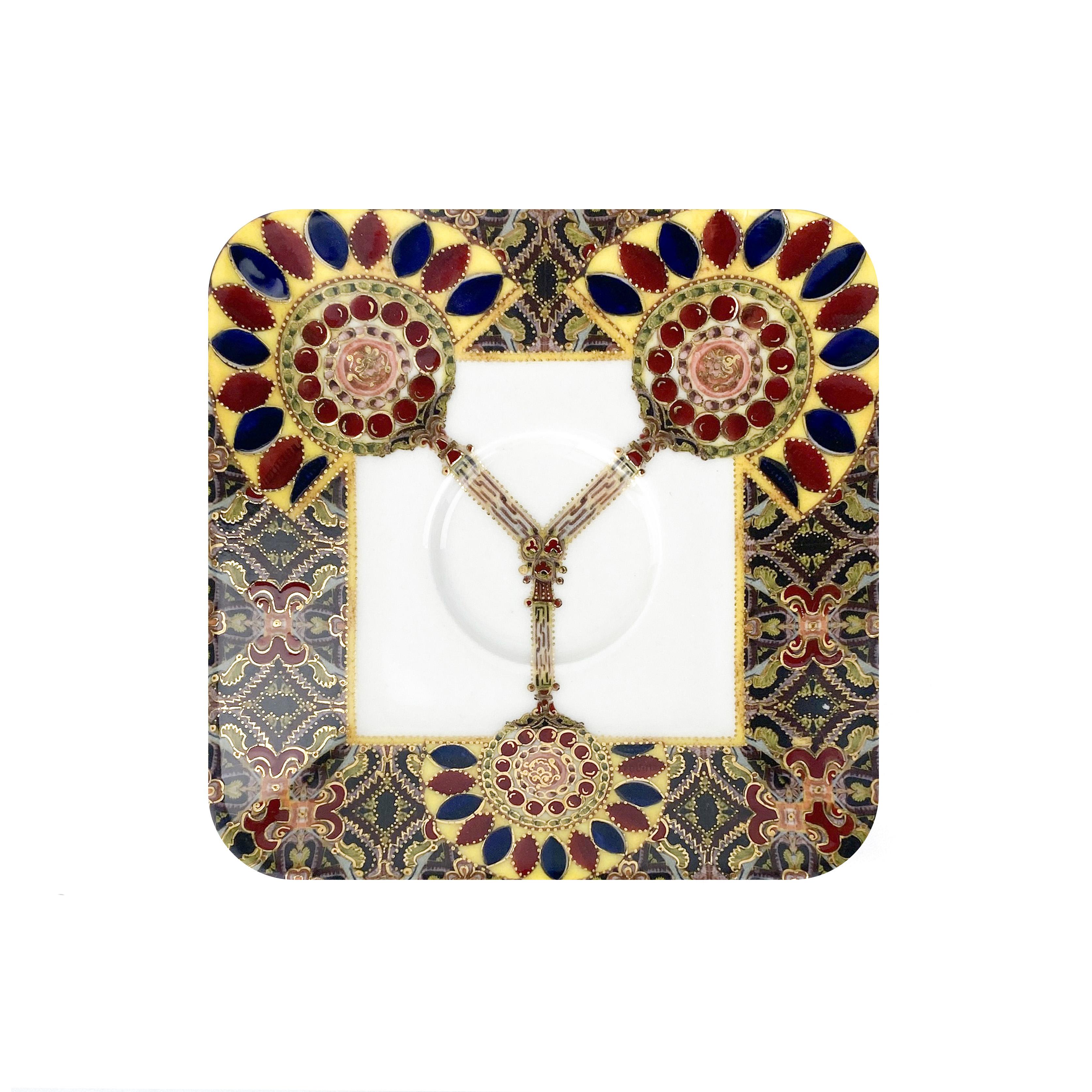 This exquisite set, featuring a porcelain coffee cup with a saucer, is adorned with Eastern ornamentation and is a stylish and functional addition to your coffee service. The vibrant pattern in shades of gold, red, purple, and yellow highlights the luxury and sophistication of these pieces. Crafted with precision and elegance, the cup and saucer are not only practical for everyday use but also serve as decorative items, adding a touch of Eastern culture and refinement to your home.