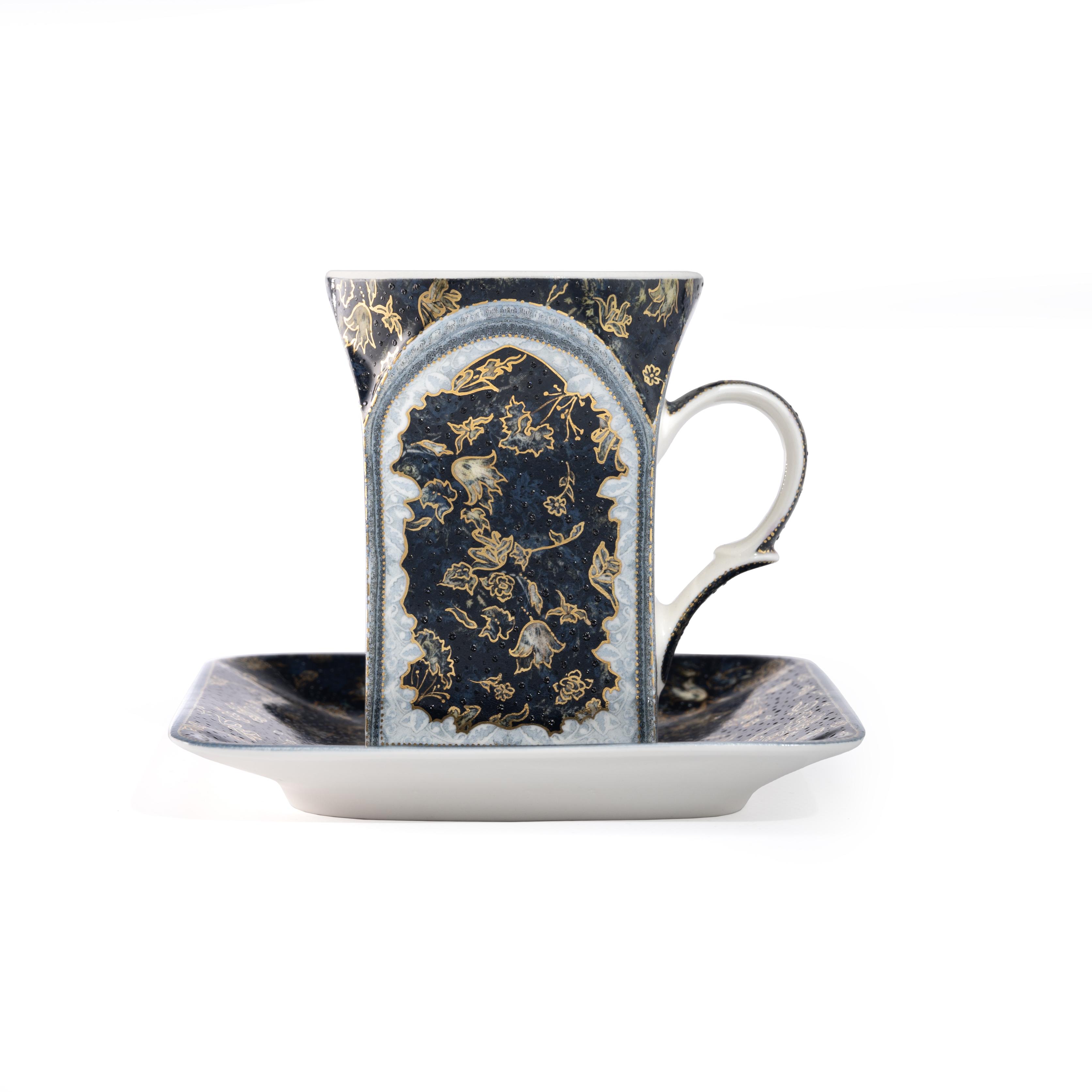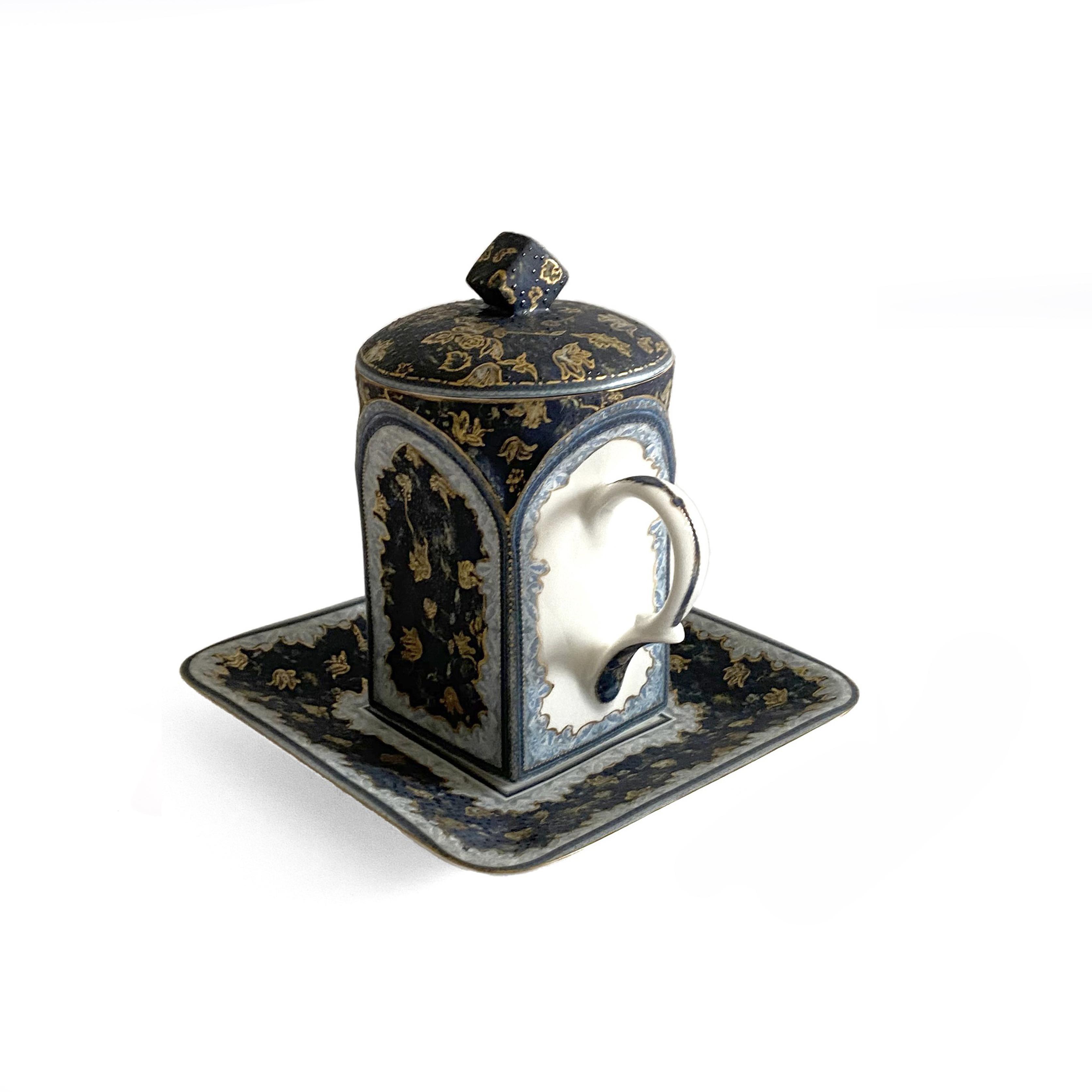 This porcelain cup reflects the quiet luxury of deep sapphire tones adorned with hand-painted golden leaves.
